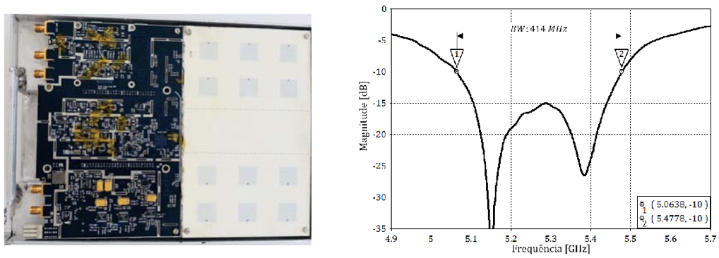 Drone-borne C-band patch antenna array with low rejection. These devices are part of a master thesis supervised by Dr. Hugo E. H. Figueroa and co- supervised by Dr. Luciano Prado de Oliveira.